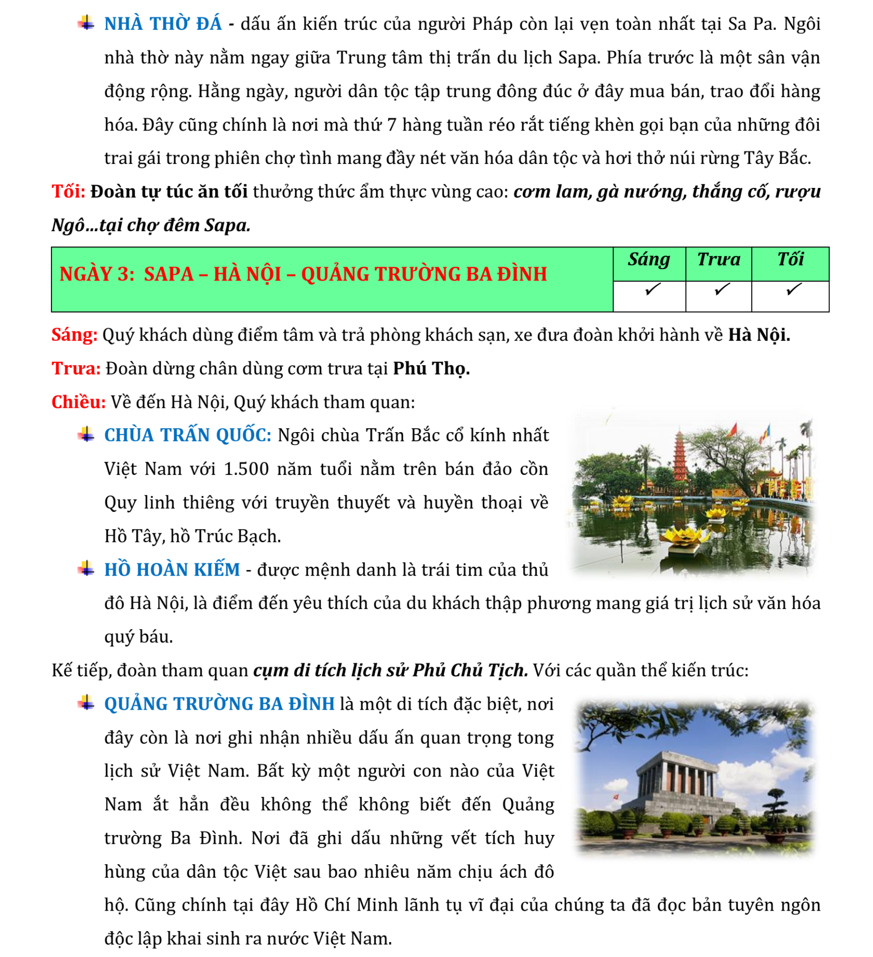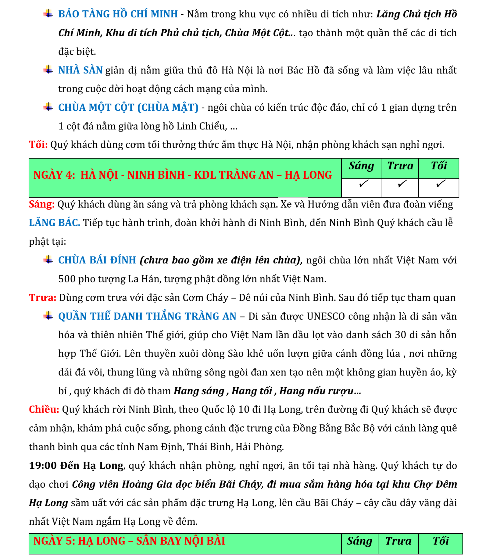 Bắt đầu từ thủ đô Hà Nội cổ kính với những con phố tấp nập và di tích lịch sử, hành trình sẽ đưa bạn đến Lào Cai và Sapa – vùng cao nguyên xinh đẹp với những thửa ruộng bậc thang bát ngát và bản sắc dân tộc độc đáo. Tiếp tục, bạn sẽ khám phá nét uy nghi của chùa Bái Đính và vẻ đẹp hoang sơ của quần thể danh thắng Tràng An. Cuối cùng, chuyến đi sẽ kết thúc với cảnh quan thiên nhiên kỳ diệu của vịnh Hạ Long – di sản thiên nhiên thế giới.