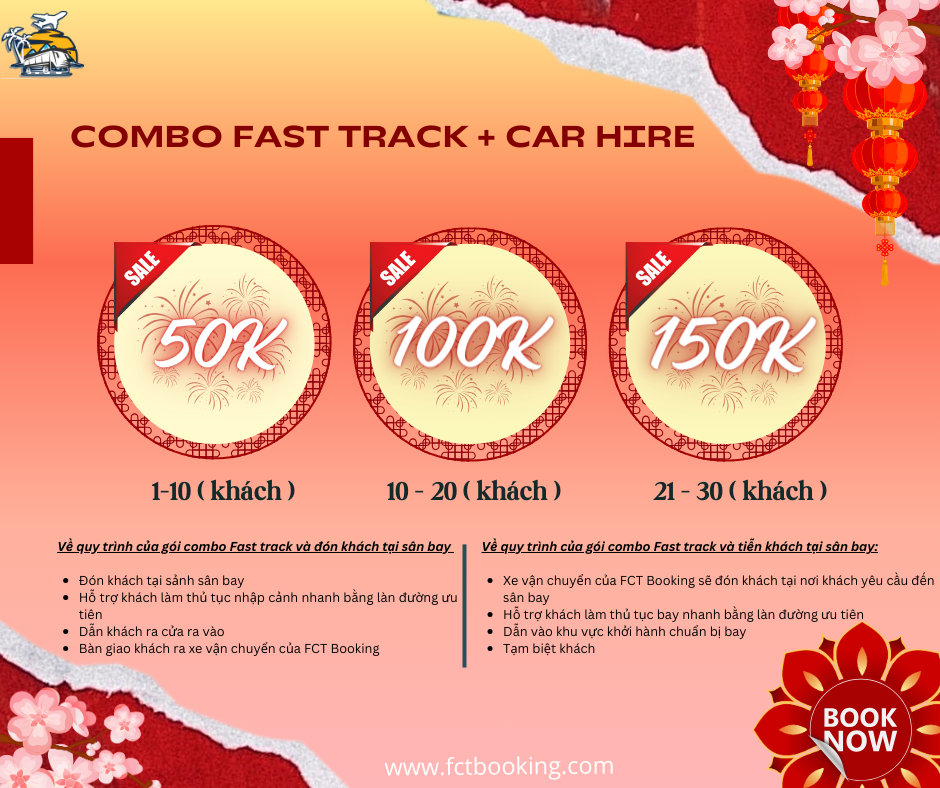 Từ ngày 10/02/2024 - 29/02/2024, đối với quý khách hàng đặt combo hai dịch vụ đón - tiễn ở sân bay và thuê xe đưa đón sẽ được hưởng với mức giá ưu đãi tại FCT Booking.