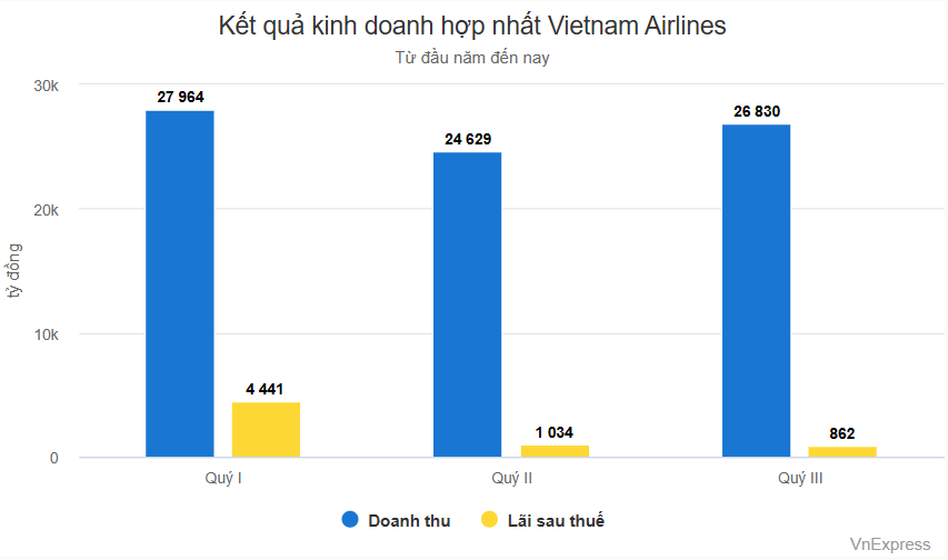 Theo báo cáo tài chính hợp nhất của Tổng công ty Hàng không Việt Nam (Vietnam Airlines), hãng đạt doanh thu 26.830 tỷ trong quý III, tăng gần 13% so với cùng kỳ năm ngoái. Trong khi đó, giá vốn bán hàng chỉ tăng nhẹ, giúp hãng đạt lợi nhuận gộp hơn 2.740 tỷ đồng, tăng gần 2,5 lần.